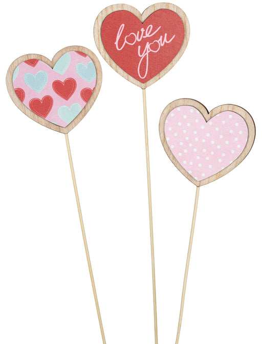 3.75" Wood Candy Hearts Pick, 3 Assorted, 12/pk