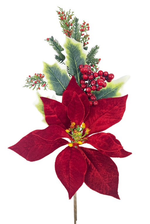18" Red Poinsettia Holly & Berry Pick, 1/ea8% Off If You Order Now!