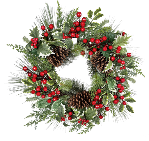 24" Red Berry, Holly & Pinecone Wreath, 1/ea8% Off If You Order Now!