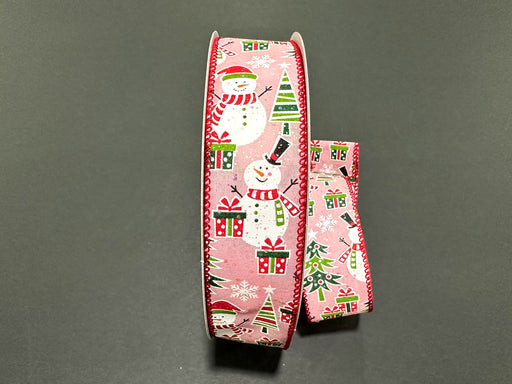 Snowman, Gifts & Trees on Pink Satin, 1.5" x 50yds, 1/rl