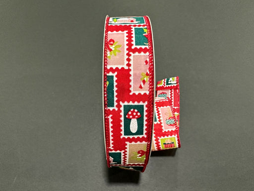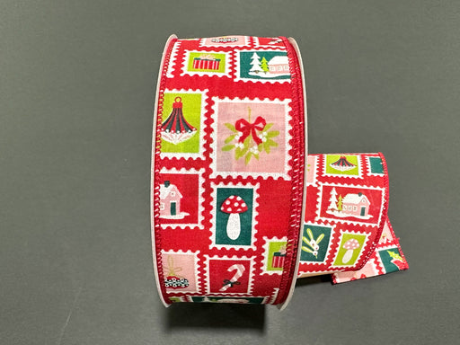 Christmas Postage Stamps on Red Satin, 1.5" x 50yds, 1/rl