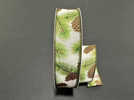 Pine Needles & Cones on Ivory Linen, 1.5" x 50yd, 1/rl