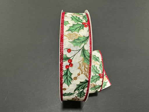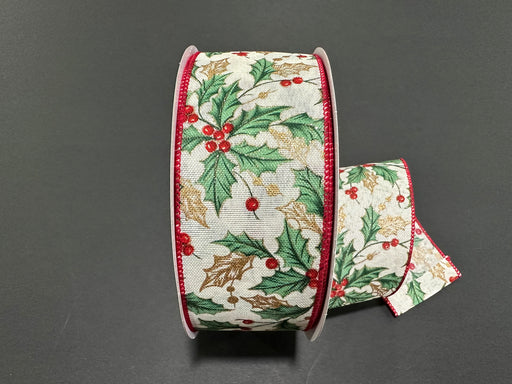 Sage & Gold Holly Leaves & Berries on Ivory Linen, 2.5" x 50yd, 1/rl