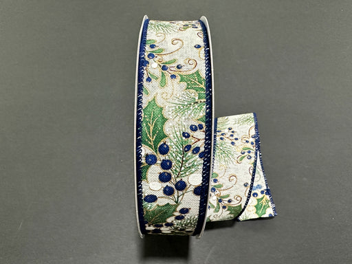 Sage Holly & Navy Blue Berries on Ivory Linen, 1.5" x 50yd, 1/rl