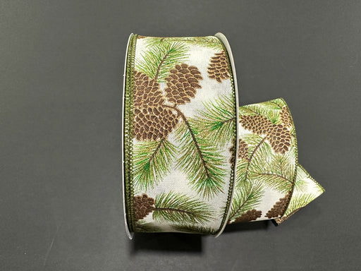 Pine Needles & Cones on Ivory Linen, 2.5" x 50yd, 1/rl