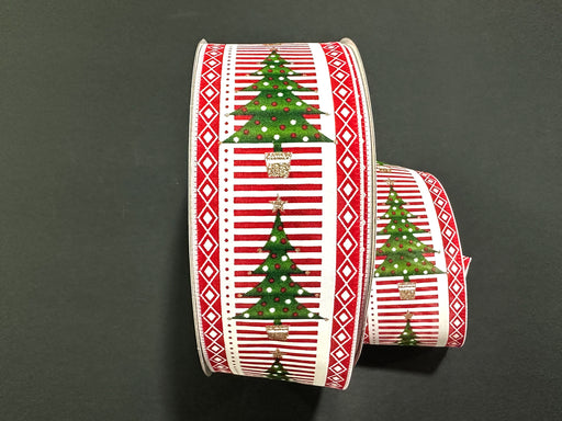 Festive Trees & Red Stripes on White Satin, 2.5" x 50yd, 1/rl