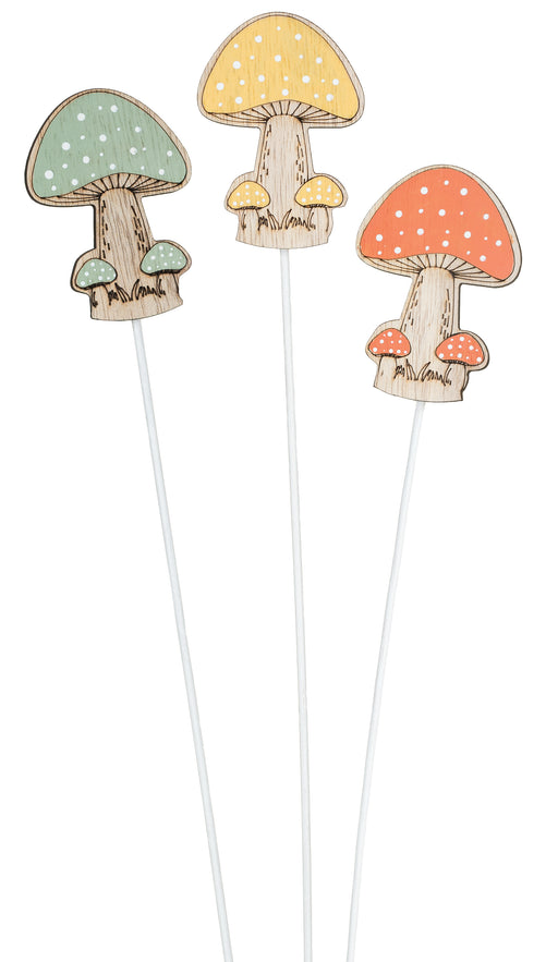 3" Wood Autumn Mushroom Pick, 3 Assorted, 12/pk